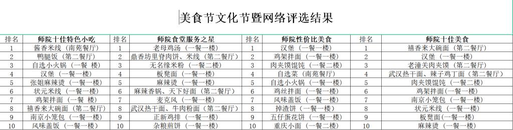美食评选分为“师院十大特色小吃”、“师院十大美食”、“师院十大性价比菜品”、“师院食堂服务之星”四大类,学生餐厅所有菜品都参加了评选。活动采取网上评选方式,共收到3万余人次投票。
