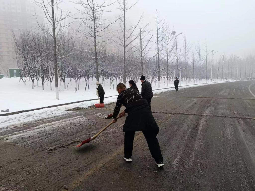 ,后勤管理处组织物业工作人员对校园各主要路段进行积雪清除工作。此举对学生搬运行李放假离校和进出校园接送学生的车辆提供了道路行驶安全保障。