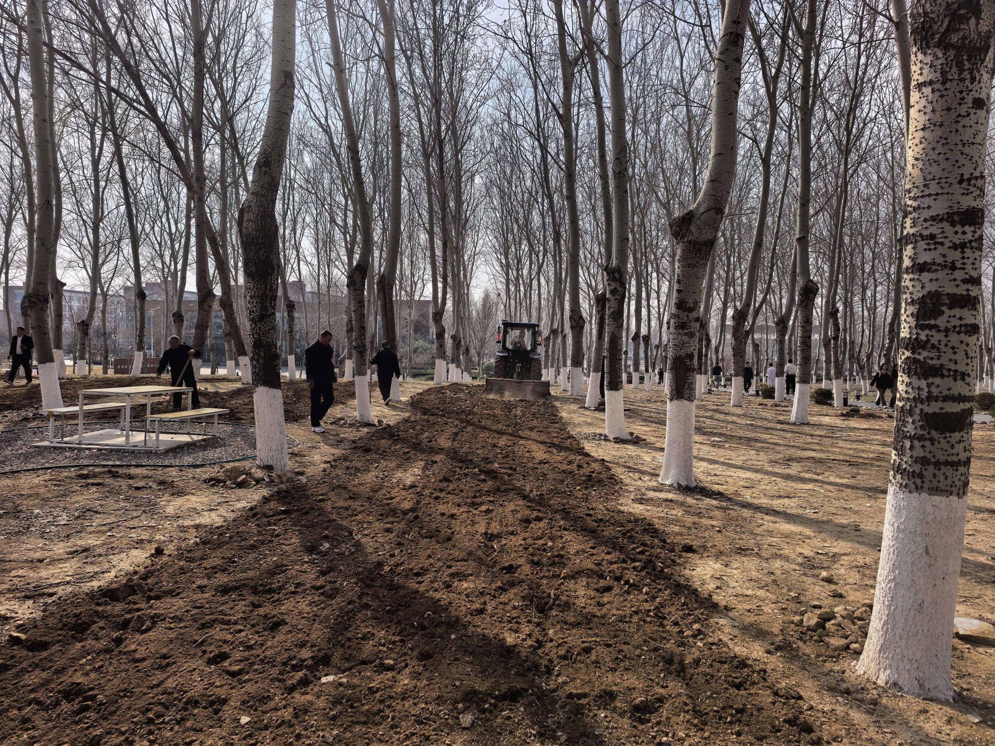 图书馆西侧杨树林翻土整地,栽种麦冬,增添绿色生机